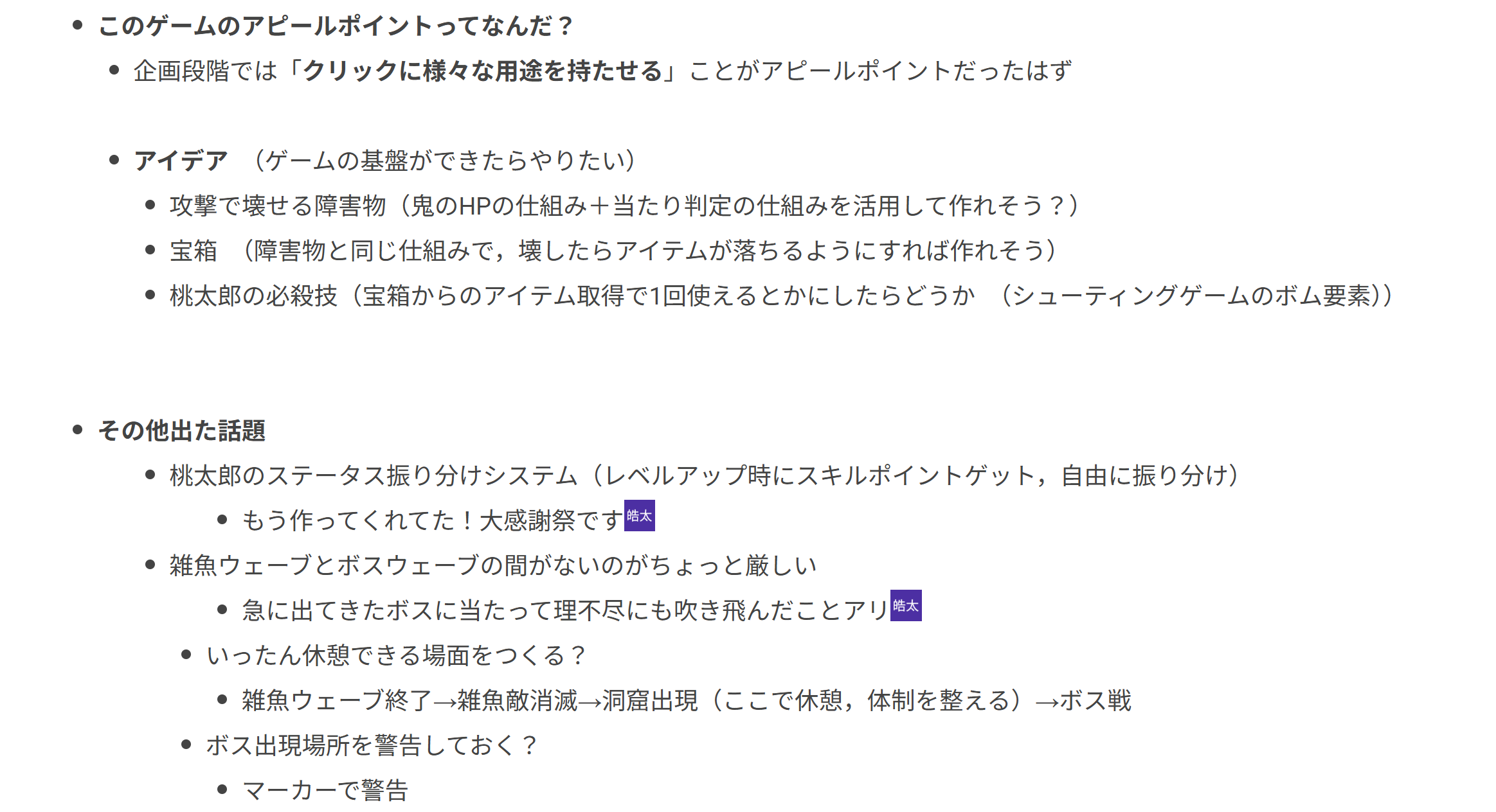 チーム内会議を何度も行うと思うが、その際には必ずCosense(旧Scrapbox)などで議事録をまとめる。何について話し合ったか、何を決定したか、誰かがこぼしたアイデア、それに対する反応... などとできるだけ網羅して簡潔にまとめていく。そしてチームメンバーが見返しても各々がこれから何をすべきなのかわかるようにしっかりと議事録内に書き残していくことが重要である。チームリーダーは責任感によって会議で話した内容を結構覚えていたりするのだが、メンバーが覚えていなかったり理解できていなかったりそもそも聞き漏らしていたりする。そういう認識のずれをできるだけ少なくするために丁寧な議事録は必須だと感じた。