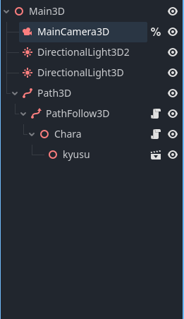 こんな感じ。カメラと光源、3Dモデル、キャラクターの移動するパスって感じですね。kyusuは先程作成した3DCGです。